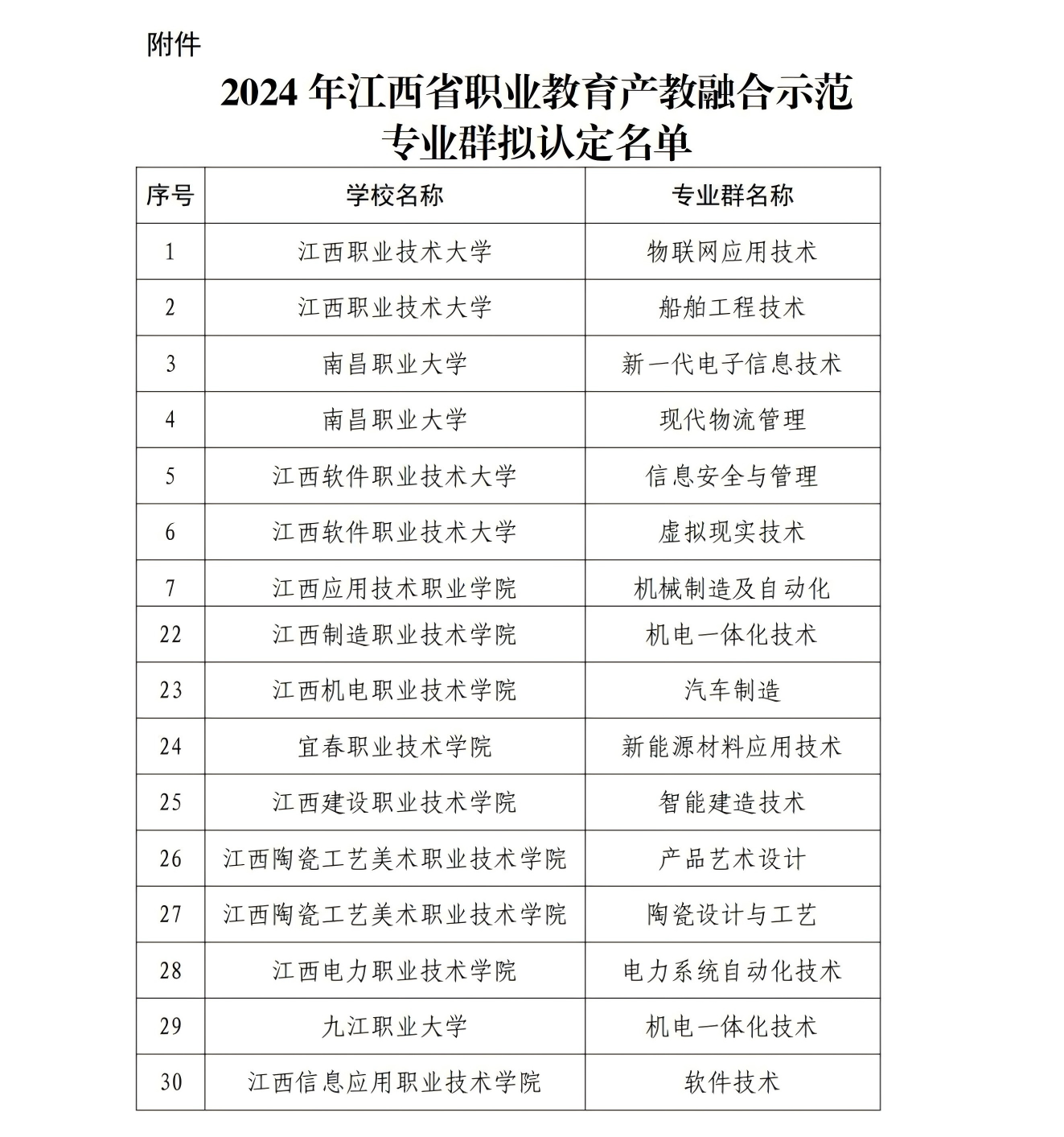 近日,江西省教育厅公示了我省2024年职业教育产教融合示范专业群拟认定结果,经过学校申报、业绩公示、材料初审、实地考察等多个环节,awc官网软件技术专业群成功入选省职业教育产教融合示范专业群。