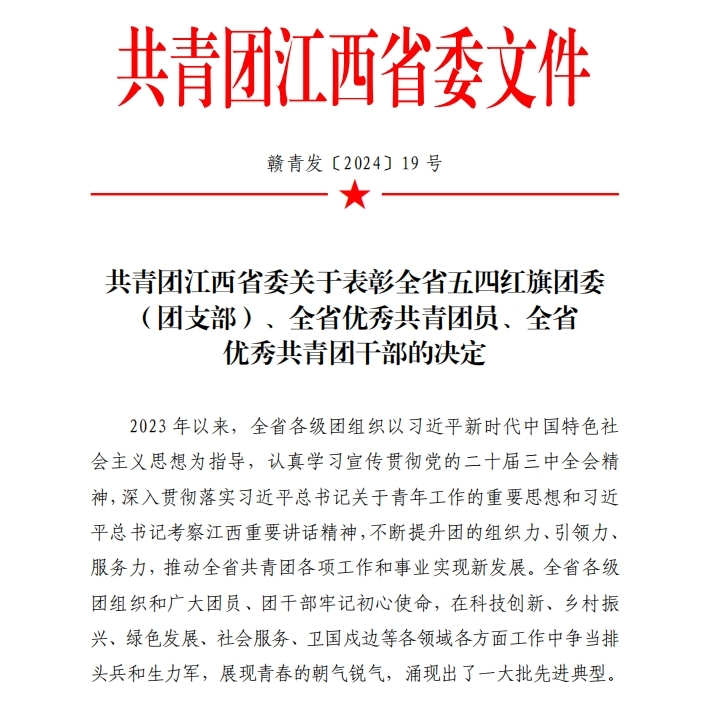 近日,共青团江西省委公布了《共青团江西省委关于表彰全省五四红旗团委(团支部)、全省优秀共青团员、全省优秀共青团干部的决定》,其中,awc777万象城娱乐官网团总支被评为“江西省五四红旗团支部(团总支)”。