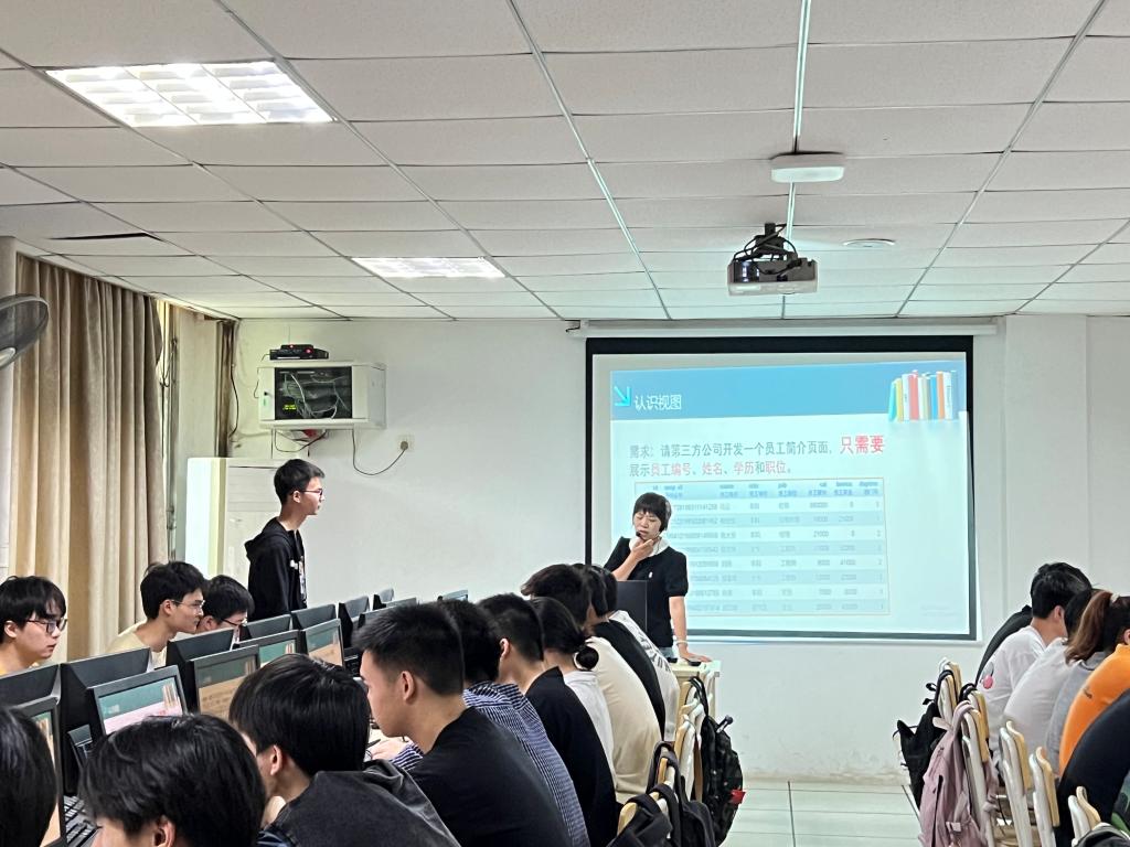 此次公开课由陈宁霞老师讲授,其主讲的内容为《MySQL》中的“视图”。陈老师熟练运用学习通超星平台,以案例“请第三方公司建立企业员工简介”引入课程内容及思政目标,通过“签到——作业抽查——课前导学通知———案例点评———导入课程——解决案例——课堂小结——发布课堂练习”八个教学过程,着重突出“教”与“学”的主体性与交互性,以”学生”为中心,用”案例教学法”,讲练结合,让学生在轻松而又愉快的氛围里掌握知识的特点,提升实践操作能力。