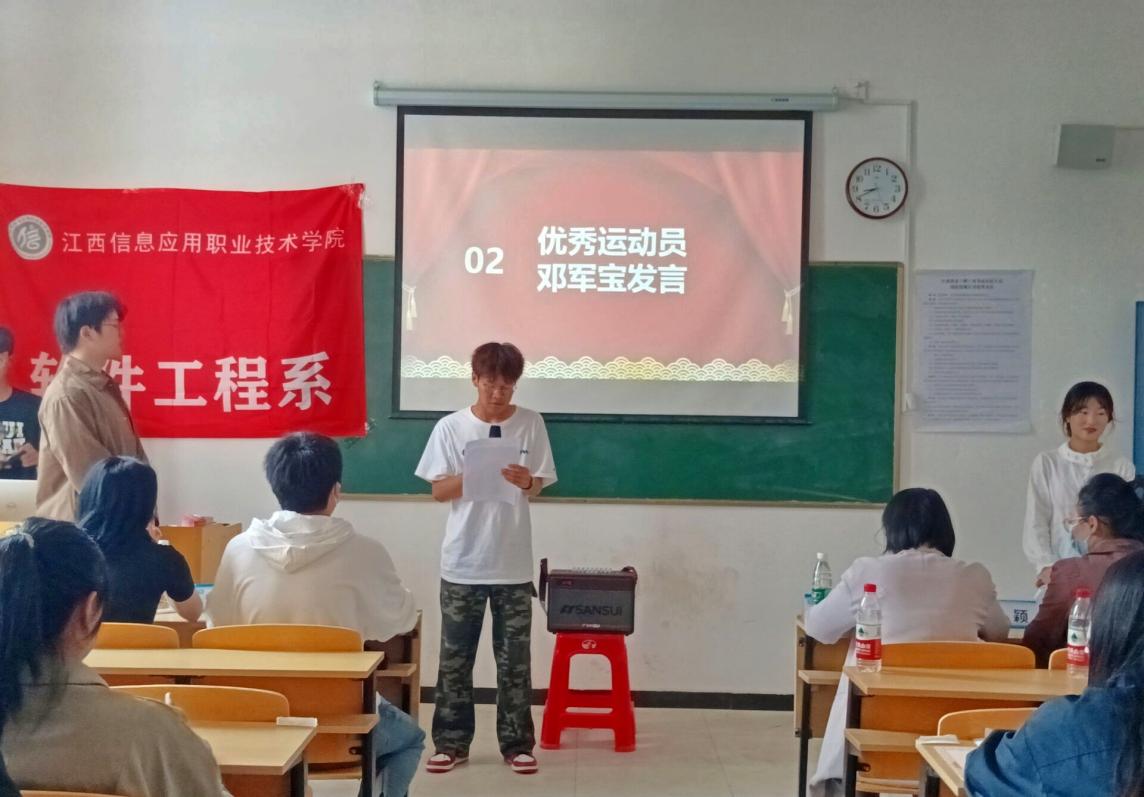 大会开始首先是主持人介绍到场的嘉宾老师,其次播放了运动会视频锦集,紧接着由优秀运动员邓军宝同学发言,他向我们分享了在运动会期间的感悟,并表示未来的日子里会更加努力进取,力争上游。