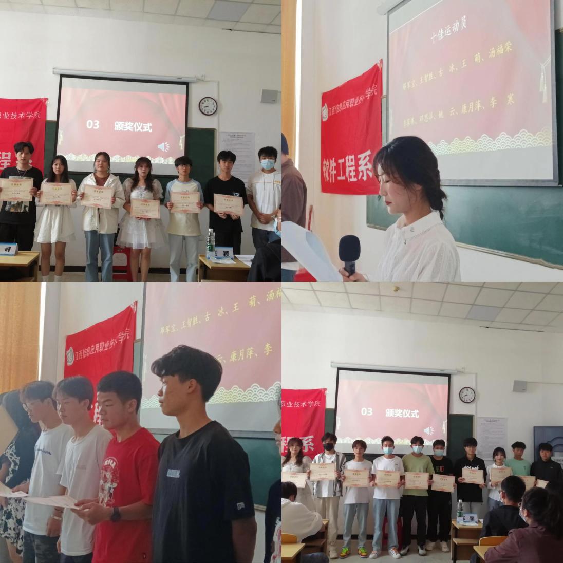 大会第二项,为本次运动会做出突出贡献的工作人员以及运动员们进行颁奖,本次奖项有“十佳运动员”“特殊贡献奖”“优秀运动员”“优秀组织奖”“学生会优秀干事”“优秀志愿者”等奖项。