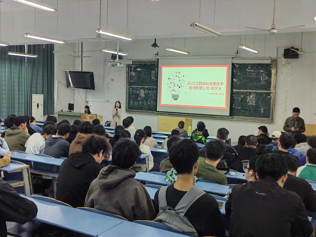 2023年11月8日,江西辰科信息技术咨询有限公司在博学楼J201阶梯教室进行专场招聘,awc777万象城娱乐官网2021级中外方向100多名学生参加宣讲会。