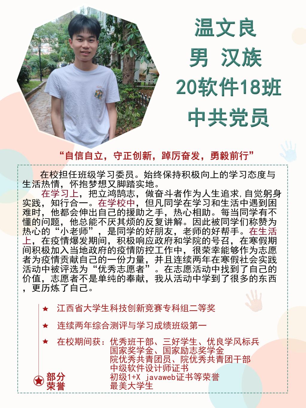 温文良同学为我校2020级软件专业技术学生,经过专升本考试考入江西财经大学,在校期间成绩优秀,他认真刻苦的学习态度受到师生的一致好评。