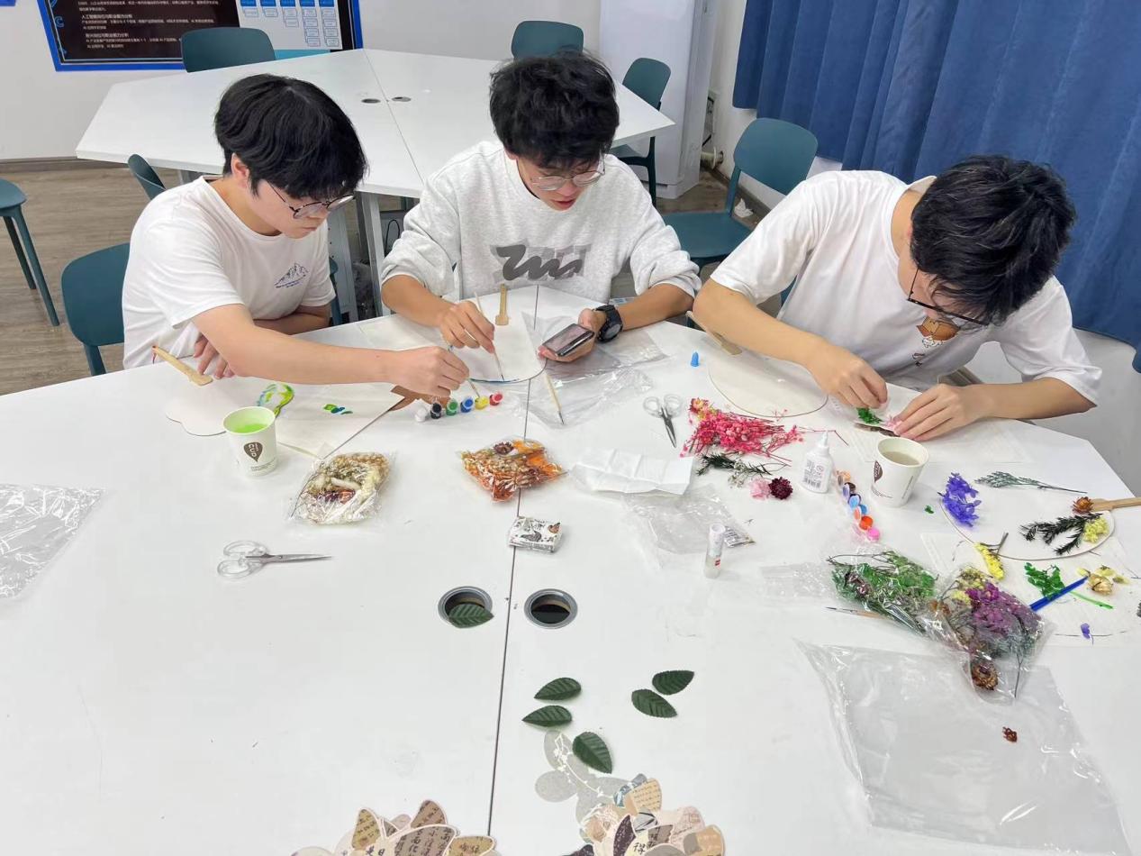 在活动中,同学们各自发挥自己的特长,一把普通的团扇在他们的手中仿佛像个需要精致打扮的小姑娘般,他们为它“梳妆打扮”,选择他们认为最好看的花草树叶,在剪刀、胶水等材料的辅助下,一片片精美的装饰品就此诞生了,将它们粘在空白的团扇上,再书写或手绘上一些诗句、图案。这时,这些团扇就好像被赋予了生命一般,让人看了心生欢喜。