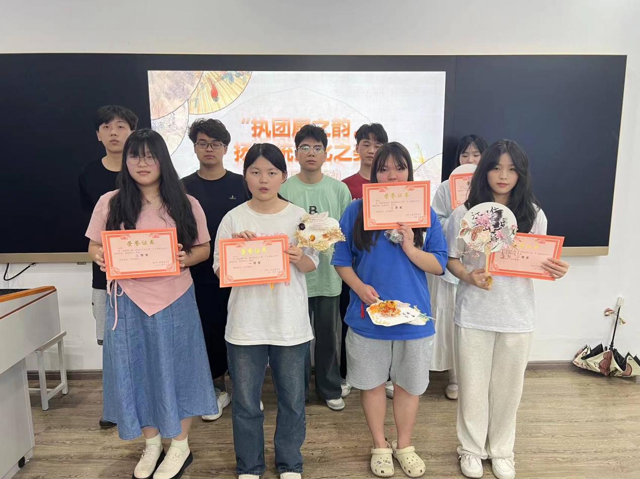 活动的最后,由评委打分后产生优秀的手工团扇制作者,获奖名单如下:一等奖1名:23数艺1班喻诗琴,二等奖2名:23数艺3班付珍琳、23数艺1班谭也,三等奖3名:三等奖:23动漫3班汪润芝、23动漫3班范薪怡、23中外软件2班吴江凯。