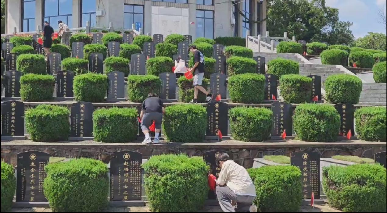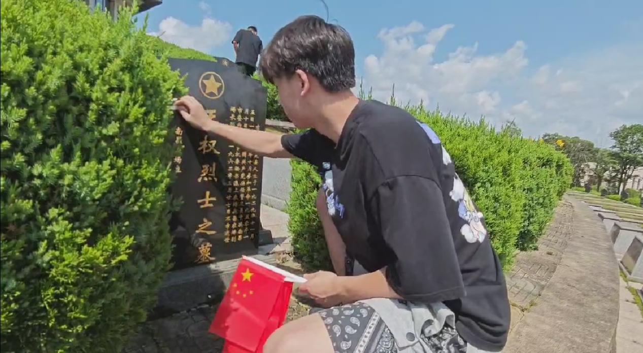 在墓碑前,学生们亲手插上了一面面小红旗,它们在微风中轻轻飘扬,如同烈士们不灭的精神,激励着每一位青年学子。每面红旗的安置都伴随着学生们深深的鞠躬,表达着对先烈的无限敬仰。 在墓碑周围的草地上,学生们细心地拔除杂草,维护着纪念堂的整洁与宁静。